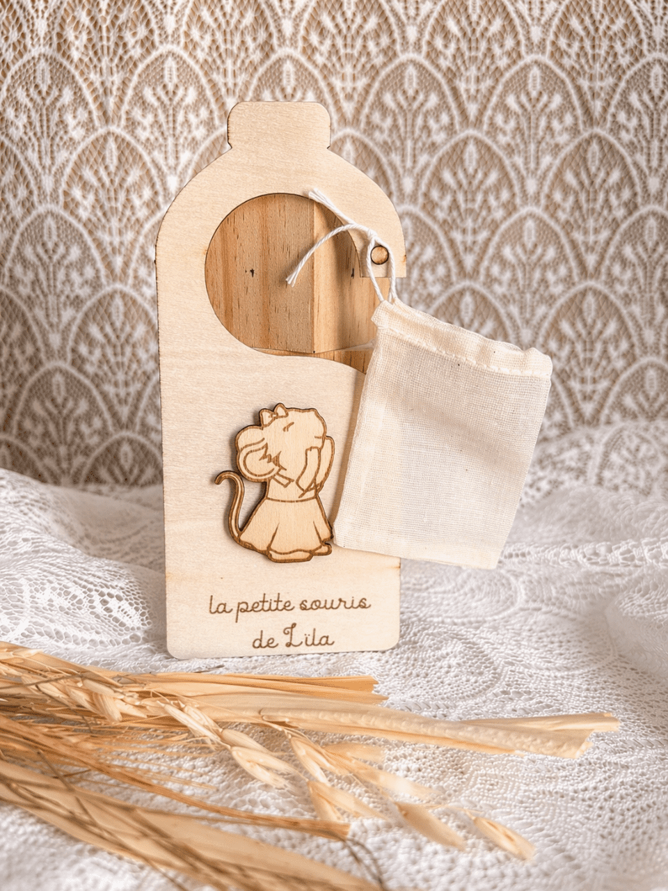 Cet accroche-porte en bois permet à la petite souris de venir récupérer la dent de lait de votre enfant et de la remplacer par une pièce ou un petit billet, tout en douceur et avec une touche de féerie.