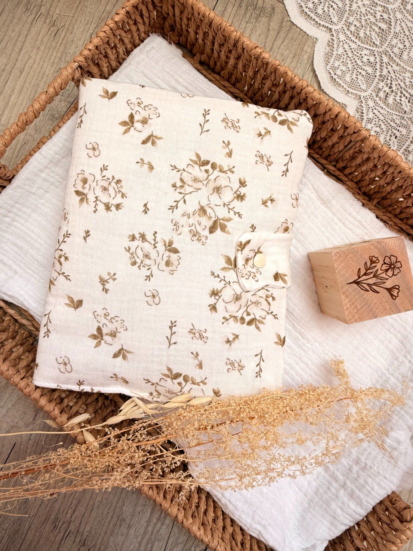 Protège carnet de santé brodé – Gaze de coton - Beige - Fleuri - Blanc